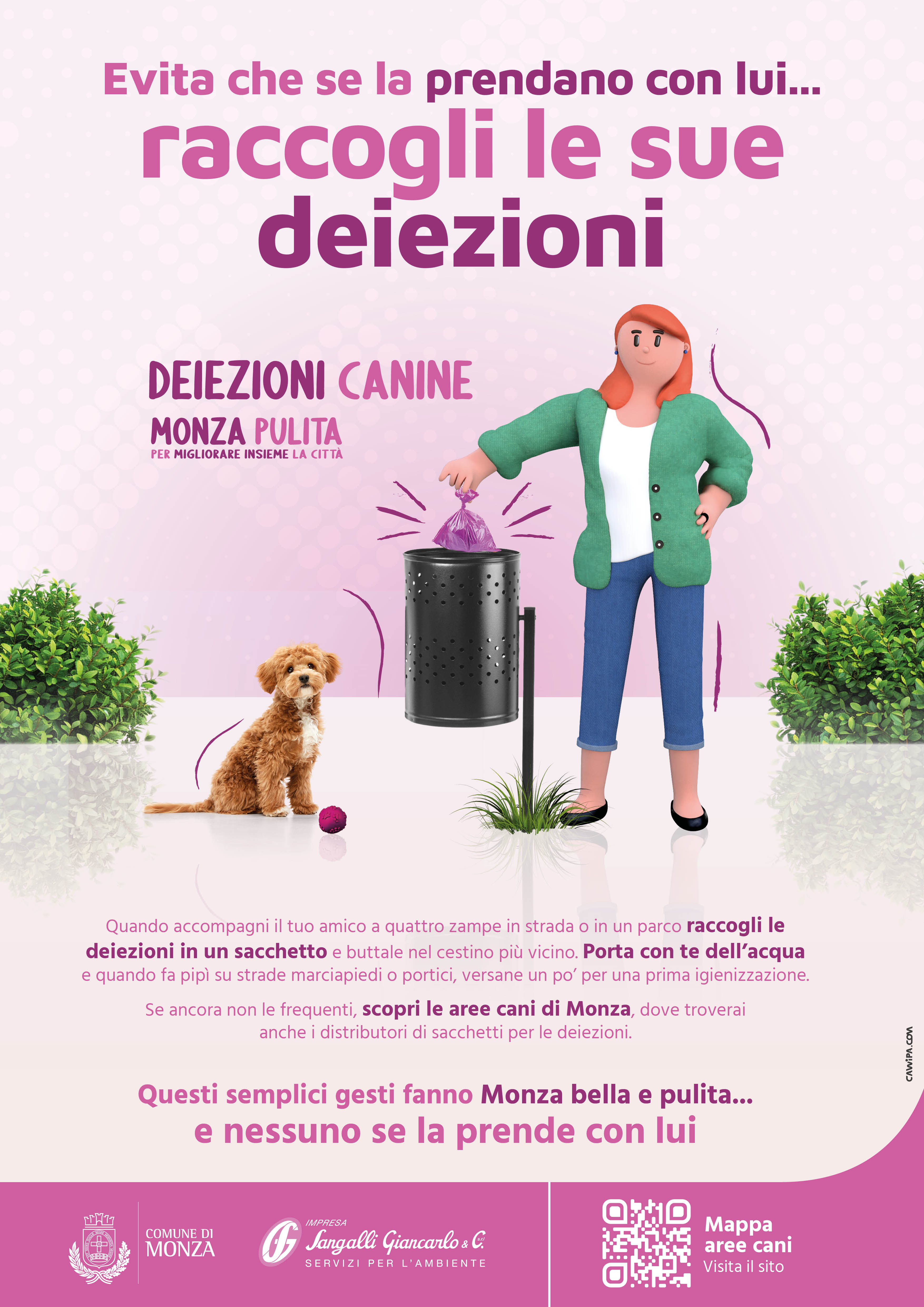 Campagna informativa e sensibilizzazione sul ritiro a domicilio. La campagna informativa è online da venerdì 13 giugno anche sul sito www.monzapulita.it (sezione tematica: “Pulizia/Deiezioni canine”), insieme all’elenco aggiornato delle aree cani, collegate alla mappa dei punti di consegna dei rifiuti.